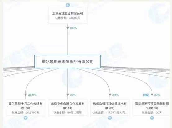 从股权穿透关系看,可可豆动画持股30%的大股东,穿透之后控股股东依然为光线传媒,同时彩条屋营业还持有十月文化28.11%的股份,为其二股东。