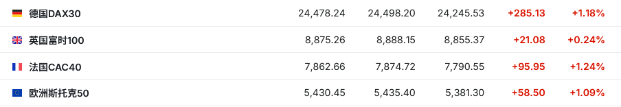 2. 截至发稿,德国DAX指数涨1.18%,英国富时100指数涨0.24%,法国CAC40指数涨1.24%,欧洲斯托克50指数涨1.09%。