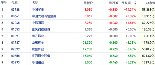 由于近期关税问题再度发酵,对全球金属市场带来冲击。港股有色概念股行情也受到影响,波动加剧。