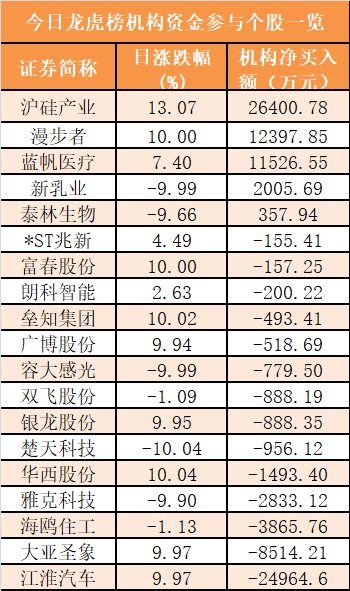 盘后龙虎榜数据显示,机构现身19股,其中沪硅产业等5股呈现机构资金净买入,江淮汽车等14股呈现机构资金净卖出。