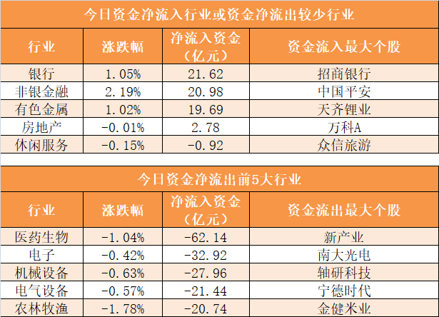 28个申万一级行业中,4个行业实现资金净流入,其中银行业净流入21.62亿元居首。