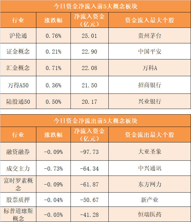 概念板块方面,今日沪伦通、证金概念、汇金概念、万得A50等概念板块资金呈现净流入,其中沪伦通概念净流入25.01亿元居首。