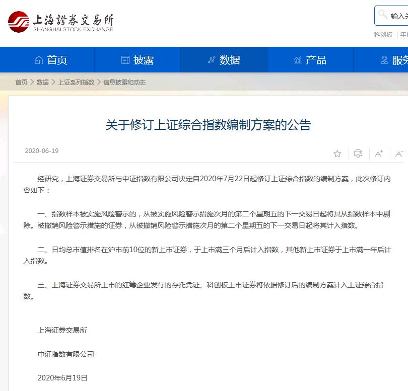为提升指数编制的科学性,增强指数的表征功能,上海证券交易所和中证指数有限公司今日宣布,将于2020年7月22日修订上证综合指数的编制方案。
