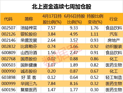以持股比例变动来看,以上95股中有11股连续七周获北上资金加仓,从行业来看,“喝酒吃药”股居多。具体来看,涪陵榨菜持股持股比例增加显著,达到1.76个百分点,该股自5月以来股价尽管下跌3.24%,但仍大幅跑赢上证指数。作为消费板块明星股,涪陵榨菜近日也获纳入富时罗素概念股。其次的是银轮股份,持股比例较七周前增加1.11个百分点,据悉该公司间接参股科创板受理企业科大国盾。