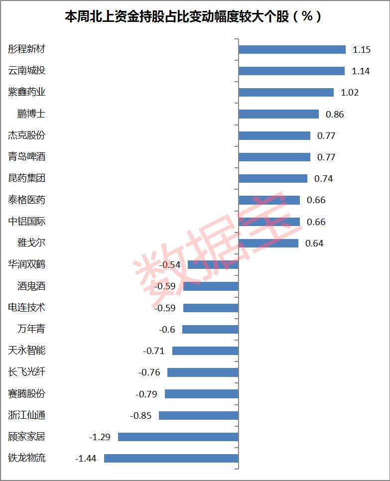 相比之下,北上资金本周增仓了601股,数量有明显增加。增仓比例超1个百分点的有彤程新材、云南城投及紫鑫药业。5G概念股鹏博士本周持股比例环比增加0.86个百分点,另外,青岛啤酒、杰克股份、昆药集团及泰格医药等6股持股比例均增超0.6个百分点。