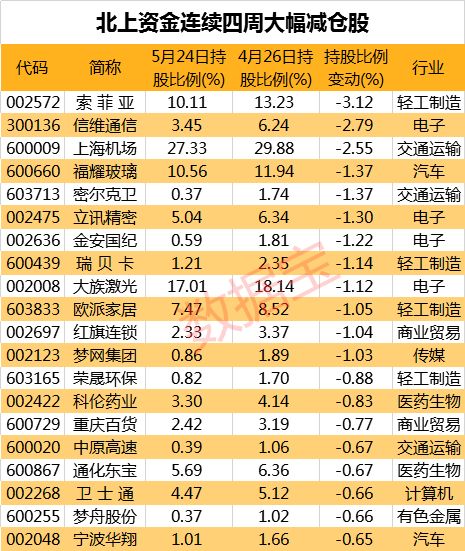 从持股比例变动来看,与四周前相比,12股减仓超1个百分点。索菲亚、信维通信及上海机场位居净卖出前三名。3股持股比例下降均超过2个百分点,其中索菲亚持股比例下降3.12个百分点。福耀玻璃、立讯精密及大族激光等股持股比例也都下降了1个百分点以上。