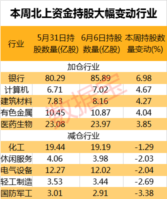 数据宝统计显示,净流入背景下,本周北上资金持股数量环比增加行业达到19个,银行、计算机、建筑材料及有色金属4行业持股数量环比增加4%以上。其中,银行板块获增仓较为显著,本周持有85.89亿股,较上周的80.29亿股增加近7%;计算机行业持股数量环比增加4.67%。另外,医药生物、房地产、非银金融行业获加仓比例均超过2.5%。可见,北上资金持股偏好有回归至大金融及大消费板块的倾向。值得一提的是,纺织服装行业连续四周获加仓,行业内的比音勒芬更是连续七周获加仓。