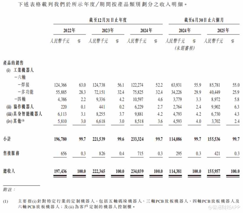业务结构上,工业机器人作为核心业务,2025年上半年贡献营收占比为86.7%,其中六轴焊接机器人和六轴多功能机器人的占比分别为55%和25.9%。协作机器人与具身智能机器人,占营收比重分别为6.3%和4.3%。