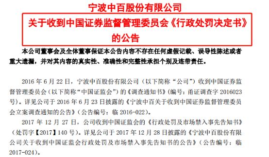 公告显示,因涉嫌信披违规,宁波中百于2016年6月收到证监会下发的《调查通知书》,经调查后,确实存在一系列违规行为,由此,证监会对宁波中百处以60万元的罚款;对公司原董事长、实控人龚东升给予警告,并处以30万元的罚款;对公司原副总经理胡慷给予警告,并处以20万元的罚款。