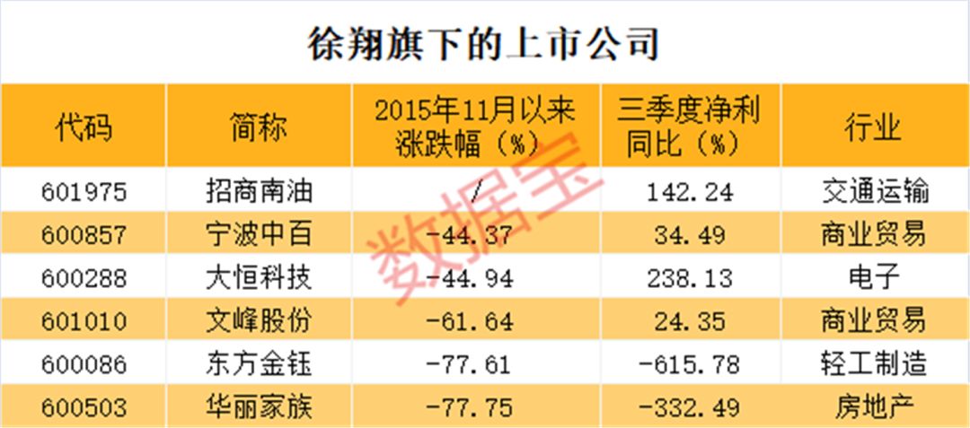 数据宝统计显示,自2015年徐翔被捕以来,他旗下的公司都出现股价下跌情况。其中,跌幅最大的是华丽家族,跌了77.75%;次之是东方金钰,跌了77.61%,而这次被调查的宁波中百和大恒科技分别跌了44.37%和44.93%。