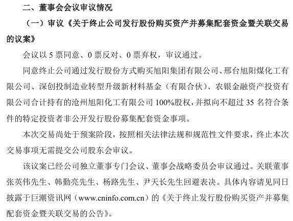 滨海能源(000695)11月14日晚间公告称,公司当日召开了第十一届董事会第二十五次会议,审议通过《关于终止公司发行股份购买资产并募集配套资金暨关联交易的议案》,同意终止公司通过发行股份方式购买旭阳集团有限公司、邢台旭阳煤化工有限公司、深创投制造业转型升级新材料基金(有限合伙)、农银金融资产投资有限公司合计持有的沧州旭阳化工有限公司100%股权,并拟向不超过35名符合条件的特定投资者非公开发行股份募集配套资金事项。