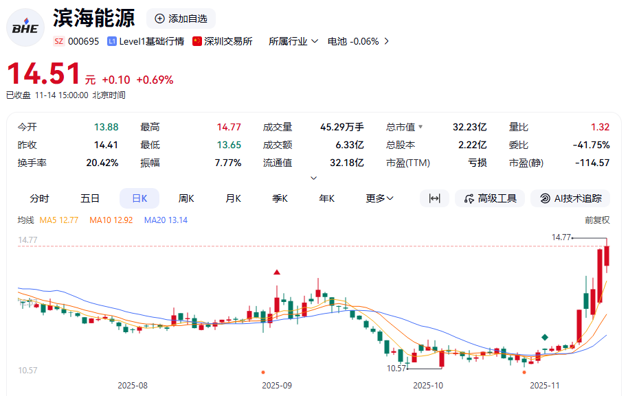 值得一提的是,滨海能源近期走势强劲,本周涨幅接近30%。截至11月14日收盘,该公司股价报14.51元/股,总市值32.23亿元。