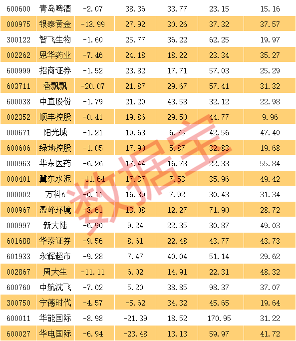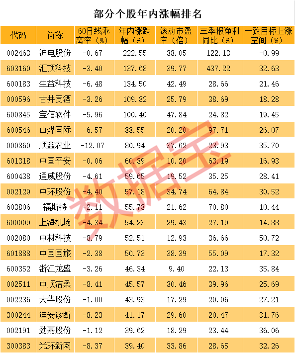 仅沪电股份一只股票现价高于一致目标价,主要系该股年内涨幅较大,达到222.55%。除了沪电股份外,榜单中还有汇顶科技、生益科技、古井贡酒、宝信软件等多只大牛股,年内涨幅均超过100%。逆市下跌的股票仅华电国际、华能国际、宁德时代等3只个股。
