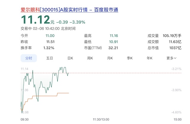 受该消息影响,2月6日上午,爱尔眼科开盘后的股价跌幅超过3%。