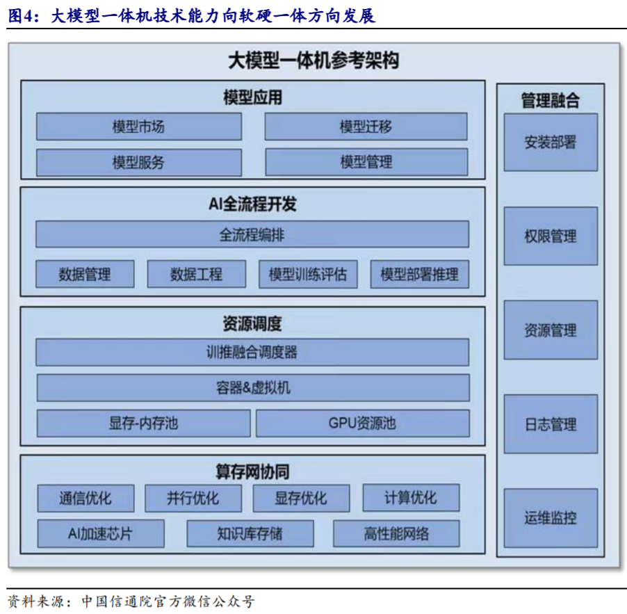 私有化部署趋势明确,进军大模型一体机开辟新增长点。DeepSeek加速企业私有化部署趋势,大模型一体机前景广阔出于数据安全、业务适配、成本控制和性能稳定性等考虑,私有化部署逐渐成为政企客户主流的大模型部署方案。在数据安全层面,政企(尤其是央国企、事业单位、政务机构、医院等)拥有国家经济命脉数据与公民隐私信息,私有化部署通过物理隔离环境(部署环境与企业内网或专用服务器集群完全隔离,不与其他组织共享计算资源)、全生命周期数据闭环(所有训练数据、推理数据、模型参数均在本地存储和处理)及定制化安全防护体系(如多层访问权限、实时监控),可在一定程度上规避公有云数据泄露风险,满足严格合规要求;在业务适配层面,政企内部业务需深度定制模型架构、接口及功能,并与现有系统(如政务审批系统、医疗数据管理系统)无缝集成,私有化部署的灵活定制能力与主动兼容性,恰好解决了公有云“少定制、难适配”的痛点;在成本控制层面,政企业务规模通常长期稳定且持续扩张,私有化部署虽初期硬件投入较高,但后期无公有云按用量付费的高昂成本,长期平均成本更可控,契合政企长期发展规划;在性能与稳定性层面,本地化部署可实现低网络延迟与高运行稳定性,满足政务处理、医疗诊断等关键内部业务对实时性与连续性的严苛要求,避免公有云依赖外部网络的潜在中断风险。