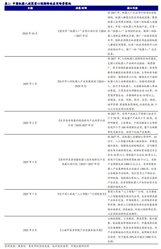 机器人政策重心转向应用落地,有场景优势的企业有望充分受益机器人政策重点鼓励应用场景落地,有场景落地优势的细分龙头有望充分受益。2024年以来,我国对机器人产业的政策重心逐渐从技术突破转向应用场景落地。2024年10月,重庆市发布《重庆市“机器人+”应用行动计划(2024—2027年)》,提出到2027年,机器人广泛应用于经济社会各领域,机器人典型示范应用成效显著;2025年1月,杭州市发布《杭州市人形机器人产业发展规划(2024—2029年)》,提出到2027年,在制造、文旅、巡检、医疗、应急、物流、城市管理、家庭服务等领域,打造形成30个以上行业应用示范场景;2025年2月,北京市发布《北京具身智能科技创新与产业培育行动计划(2025-2027年)》,提出到2027年,培育产业链上下游核心企业不少于50家,形成量产产品不少于50款,在科研教育、工业商业、个性化服务三大场景实现不少于100项规模化应用,量产总规模率先突破万台,培育千亿级产业集群;2025年3月,深圳市发布《深圳市具身智能机器人技术创新与产业发展行动计划(2025—2027年)》,提出到2027年,新增培育估值过百亿企业10家以上、营收超十亿企业20家以上,实现十亿级应用场景落地50个以上,关联产业规模达到1000亿元以上,具身智能机器人产业集群相关企业超过1200家;2025年7月31日,国务院常务会议审议通过《关于深入实施“人工智能+”行动的意见》,提出要大力推进人工智能规模化商业化应用,充分发挥我国产业体系完备、市场规模大、应用场景丰富等优势,推动人工智能在经济社会发展各领域加快普及、深度融合,形成以创新带应用、以应用促创新的良性循环。8月6日,上海市人民政府办公厅发布《上海市具身智能产业发展实施方案》,提出要以物流装配、工业制造、商业零售、医疗康养、家政服务等领域为牵引,开展场景征集与任务揭榜,探索具身智能应用新业态,对产业创新融合示范应用项目,按照核定项目总投资,给予最高20%且不超过1000万元支持。我们认为,人形机器人的下一个阶段是以订单为导向的场景落地。此前中国移动采购宇树和智元机器人产品,订单规模1.24亿元;优必选中标觅亿汽车9051.15万元机器人设备采购项目,表明机器人产品在多个场景加速释放订单。展望未来,具备场景落地能力的细分赛道龙头企业,有望通过与人形机器人本体企业的合作,充分享受机器人产业政策红利和市场增长的双重收益。