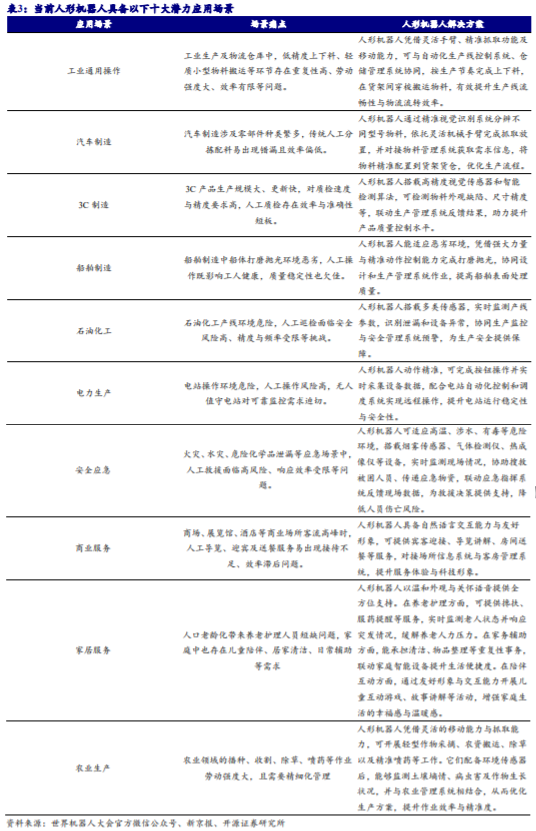 人形机器人逐步从实验室走向现实世界,具备十大潜力应用场景。当前,人形机器人技术加速演进、产品不断迭代,正逐步从实验室走向现实世界,展现出巨大的应用潜力。在2025年8月的世界机器人大会上,中国电子学会组织遴选出工业上下料与搬运、汽车制造分拣、3C质检、船舶打磨、石化巡检、电力操作、安全救援、商业迎宾、家庭陪护、农业精细作业等人形机器人十大最具潜力应用场景。