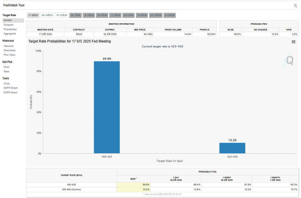 根据芝加哥商品交易所集团(CME Group)的FedWatch工具,目前美联储9月降息的可能性高达89.8%,而按兵不动的可能性仅为10.2%。