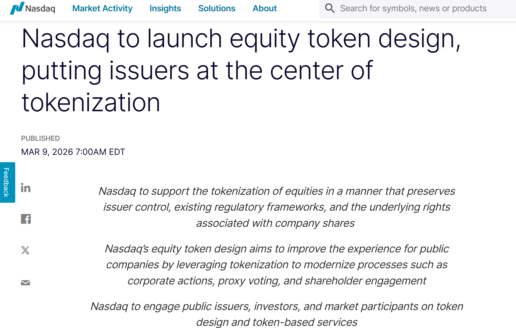 纳斯达克周一发布公告称,计划推出一种新的代币化股票机制,侧重于帮助上市公司更好地控制其代币化的股票。该框架计划于2027年上半年投入运营,届时代币化股份持有者将享有与基础证券的投资者相同的治理权。