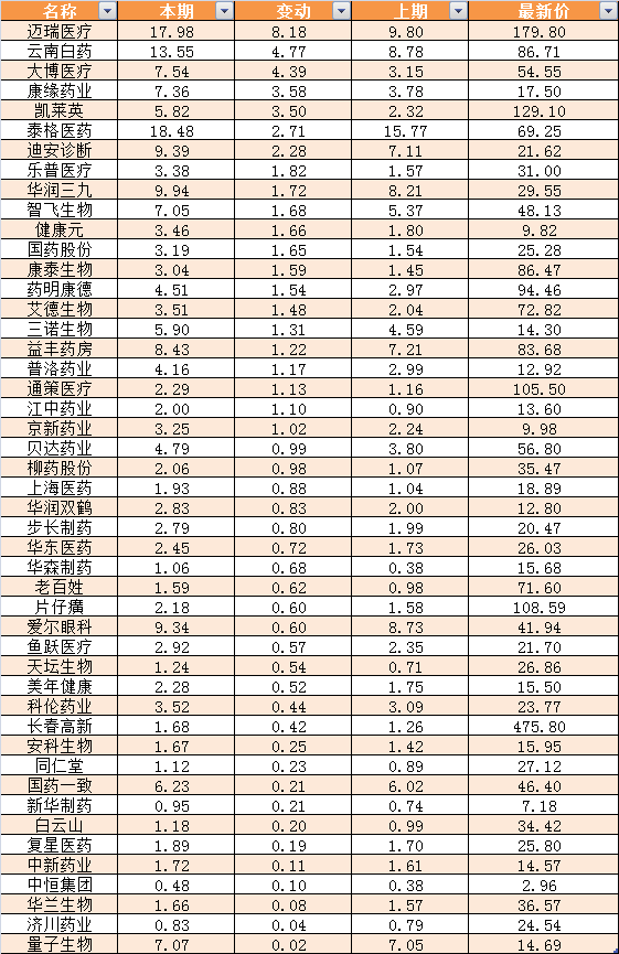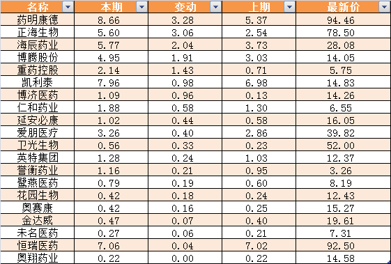 三季报数据显示,生物医药行业三季度基金加仓且占流通股比例提升的公司主要有19家,其中药明康德基金持股占流通股比例提升最高,上升3.28%达到8.66%,正海生物也从2.54%上升至5.60%,提升超过3%。博腾股份、重药控股基金持股比例提升超过1%。