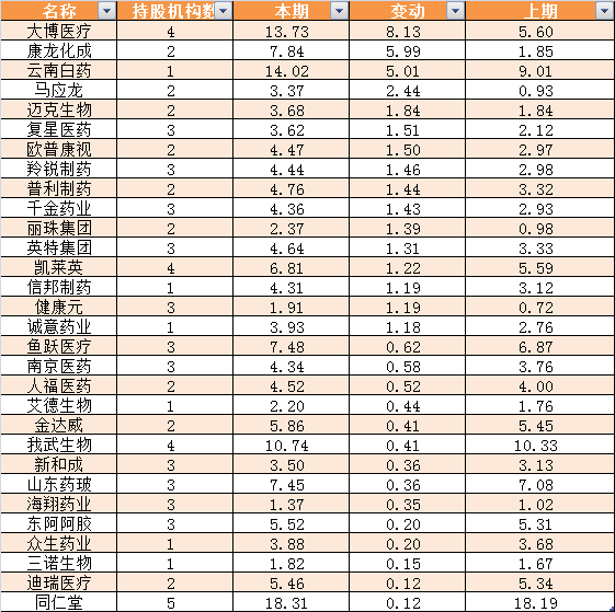 社保基金、企业年金、保险公司三季度基金合计持股且占流通股比例提升的公司主要有30家,其中大博医疗持股比例由于由5.60%大幅提升至13.73%,提升幅度达8.13%,康龙化成、云南白药三类机构持股比例均提升5%以上。马应龙、迈克生物、复星医药、欧普康视、羚锐制药、普利制药、千金药业、丽珠集团、英特集团、凯莱英、信邦制药、健康元、诚意药业三类机构合计持股比例提升幅度均在1%以上。