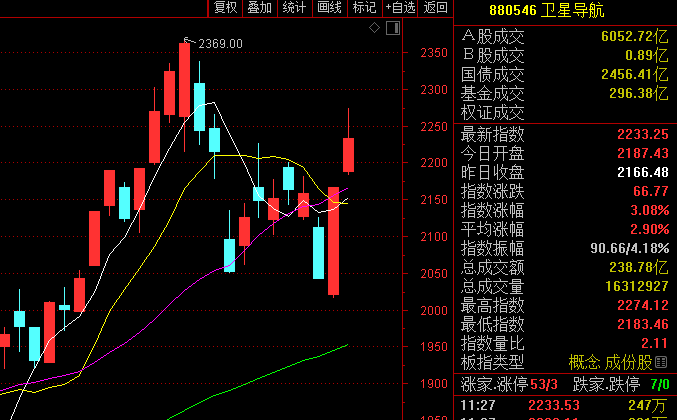 受此利好影响,今日早盘卫星导航板块在昨日飙升6.14%的基础上,再涨3.08%,成交量急剧放大,半日成交超昨日全天成交量。烽火电子、长江通信、天银机电涨停,中国卫星、航天宏图等涨幅居前。