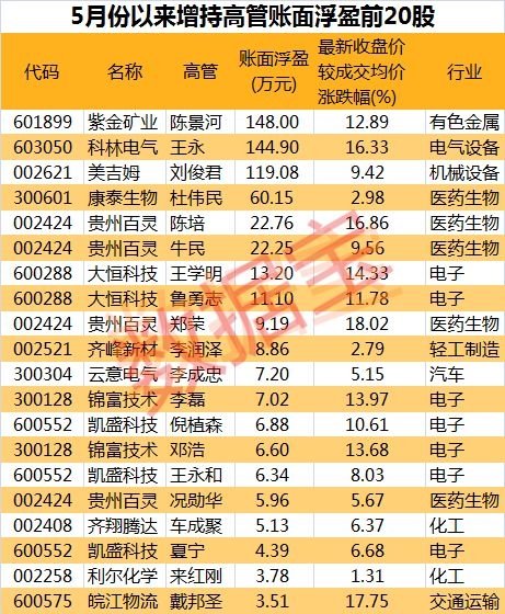 另外,康泰生物的杜伟民、贵州百灵的陈培、牛民以及大恒科技的王学明账面浮盈均超过10万元。不过也有个别高管因股价下跌,导致账面浮亏。如高管鲜丹5月6日增持华峰超纤200万股,成交均价14.37元,最新收盘价13.9元,账面浮亏94万元;神农基因高管曹欧劼账面浮亏89.09万元。
