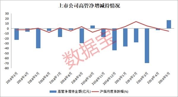 将时间轴拉长来看,沪指5月份累计跌幅远高于过去六个月。作为提振信心的重要动力,数据宝统计显示,上市公司高管5月份以来净增持金额16.61亿,而纵观过去的14个月(2018年3月至2019年4月),仅2018年10月高管净增持6.23亿元,其余月份高管持股动向均为净减持。也就是说,高管净增持金额创近15个月以来新高。