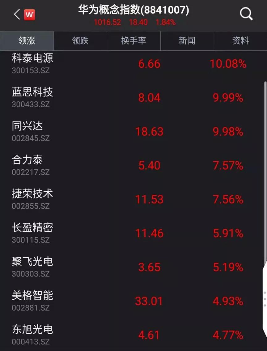 华为概念股全线飘红,科泰电源、蓝思科技、同兴达涨停,合力泰、捷荣技术涨逾7%。