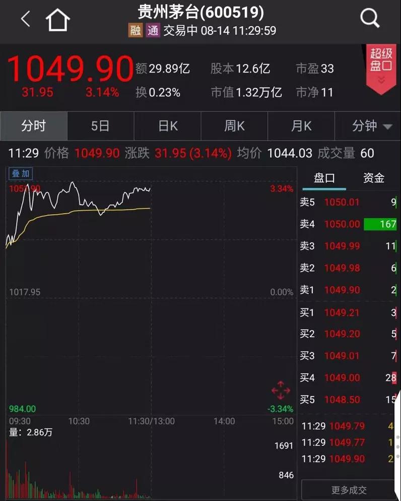 在利好消息的助推下,8月14日上午,A股全线上涨,上证综指高开1%以上,电子元器件、计算机板块领涨。苹果概念股、华为概念股、石墨烯板块表现强势,全面飘红。贵州茅台股价盘中更是触及1051元的历史新高价。
