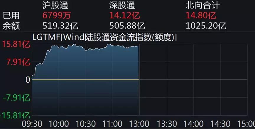在A股信心大涨的同时,北向资金今日也表现活跃。截至上午收盘,北向资金净流入超过14亿元。