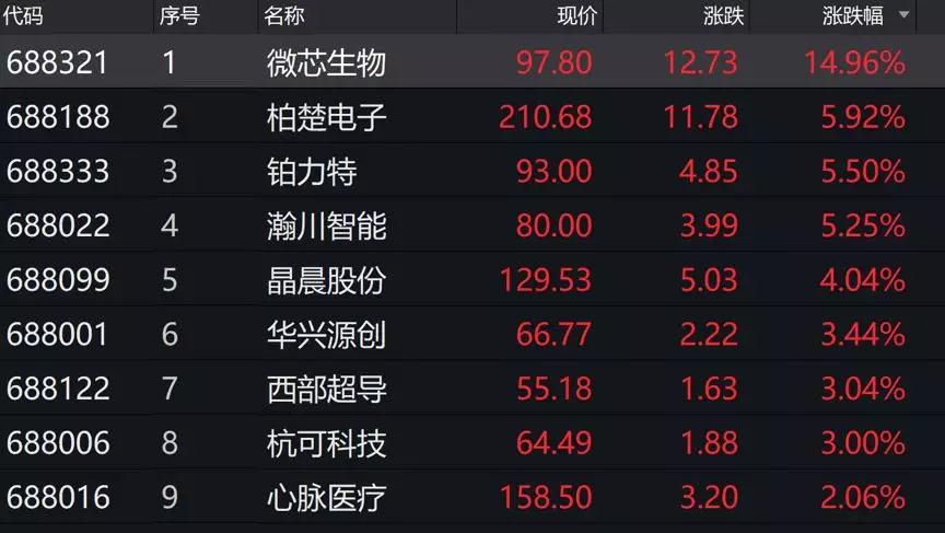 科创板方面,个股早盘普涨,仅沃尔德一股下跌。截至上午收盘,微芯生物大涨14.96%,柏楚电子、铂力特涨幅超过5%。