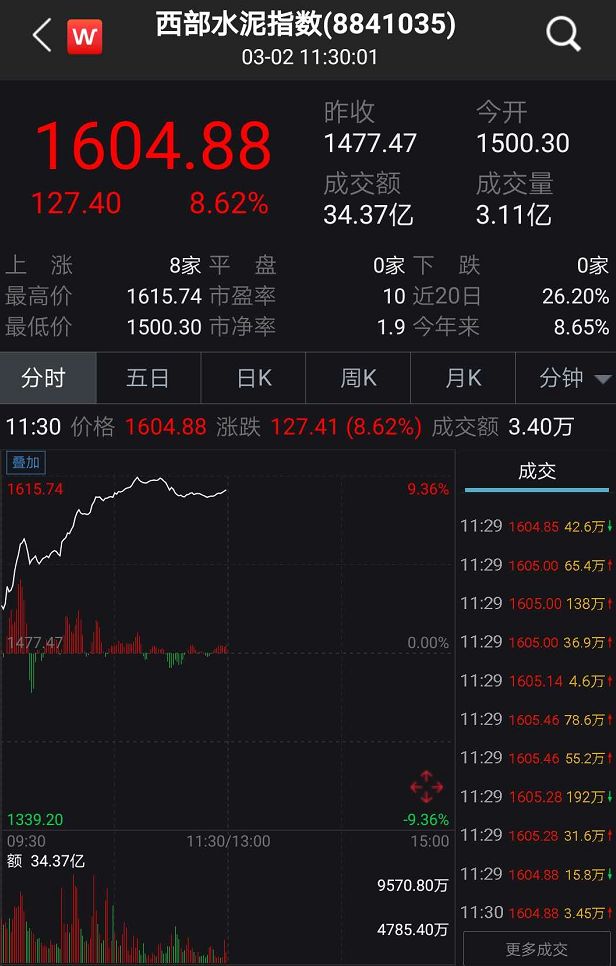 从wind概念板块看,西部水泥指数涨幅凶猛,指数一度涨超9%以上,盘中青松建化、上峰水泥等多只个股强势涨停。