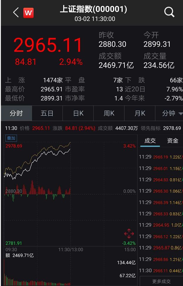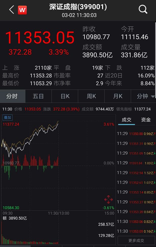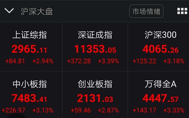 截至午盘收盘,上证综指涨2.94%,深证成指涨3.39%,创业板指涨2.87%,短短半日,A股市值大涨超2.25万亿。
