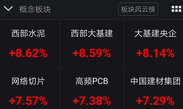 此外,西部大基建、大基建央企、中国建材集团等多只和基建板块相关的概念题材几乎全线爆发。
