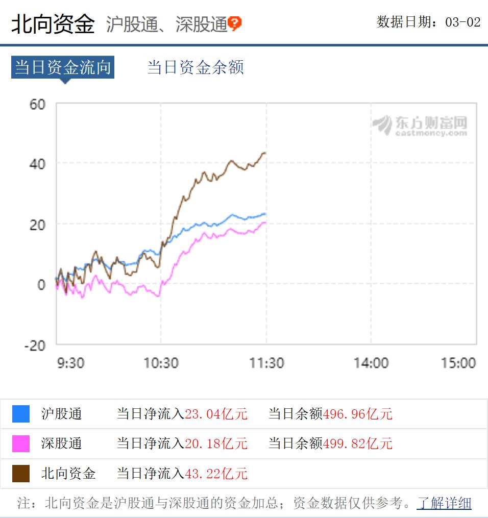 数据显示,今天上午,北上资金净流入已经超40亿元。