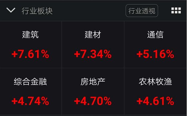当天上午,两市建筑、建材两大行业板块涨幅均超7%以上,而房地产板块涨幅也一度逼近5%以上。