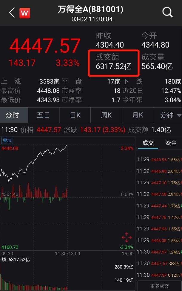 从成交量看,A股市场依然呈现量价齐升的态势。据万得全A数据显示,当天上午,两市成交已经超6300亿元。