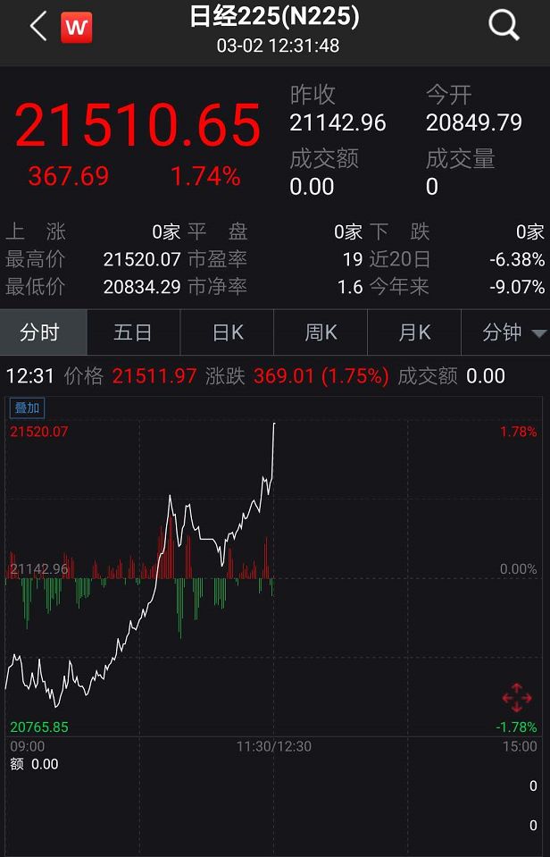 消息发布后,日经225指数一扫上周阴霾行情。盘中指数一度反弹超2%以上。