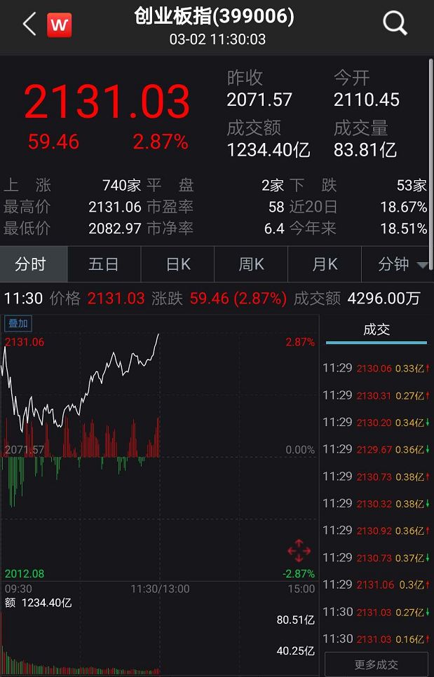 创业板指数开盘高开,随后有所回落,但临近10点30分左右,指数再度重新抬升,涨幅突破2%以上。截至午盘收盘,创业板指报收2131.03,,涨幅2.87%。