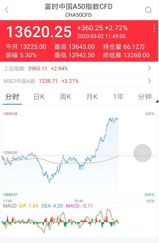 截至3月2日11点50分,A50指数重新拉升,涨幅约2.72% ,美股期货也重新上涨。