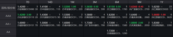 一级存单方面,今日3M国股在1.57%-1.59%位置需求较好,1Y期国股报在1.60%-1.65%的位置。二级存单方面,6M国股成交在1.6150%附近(较前一日上行0.5BP),1Y国股成交在1.6250%的位置(较前一日变化不大)。