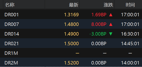银行间回购定盘利率多数上涨。FR001跌1.0个基点报1.39%;FR007涨1.0个基点报1.54%;FR014涨5.0个基点报1.65%。