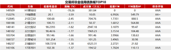 据Choice 数据统计显示,今日交易所市场非金信用债跌幅排行前五的分别是:H1碧地02、19瑞丽债、21汉江02、21锡交01、22大悦02。具体如下: