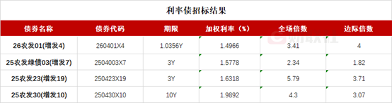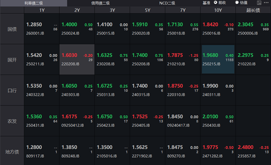 银行间主要利率债收益率涨跌不一,截至下午16:30,10年期国债活跃券250016收益率下行0.1bp报1.842%,30年期国债活跃券2500006收益率上行0.35bp报2.3045%,10年期国开活跃券250215收益率上行0.4bp报1.968%。