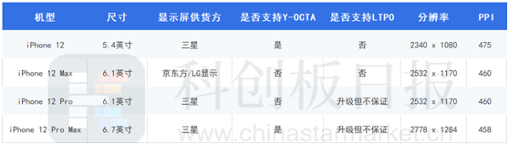 根据MacRumors整理,目前四版本iPhone 12显示屏供应商及搭载功能大抵如下: