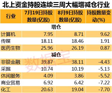 值得一提的是,3个行业近三周连续获北上资金加仓,分别是计算机、传媒、医药生物行业。其中,计算机行业持股数量较三周前增幅较大,达到9.62%;另外,传媒行业持股数量较三周前增幅也较大,达到1.91%。与此同时,8行业近三周连续遭减仓,化工、商业贸易及休闲服务等4行业持股数量较三周前均下降5%以上。