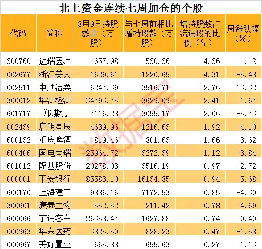 值得一提的是,以上83股中共有15股自6月21日以来连续七周获加仓。以增持股数占流通股比例来看,迈瑞医疗、浙江美大及中顺洁柔位居前三位,增持股数占流通股比例分别为4.36%、4.31%及2.76%。美好置业、华东医药及宇通客车占比最低,均低于1%。