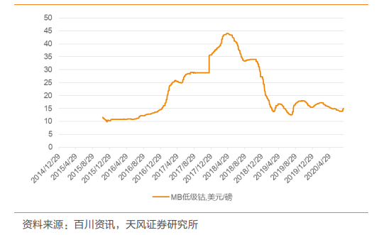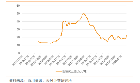 2.、钴价格在年后被疫情影响压得太低,在2019年钴价格就开始向上恢复的过程,此前价格一路打压导致矿端投产进度放缓,手抓矿产量下降,嘉能可Mutanda停产,钴的供需过剩局面改善,钴价格开始恢复,2019年的预期便是钴价格恢复到35万元/吨附近。