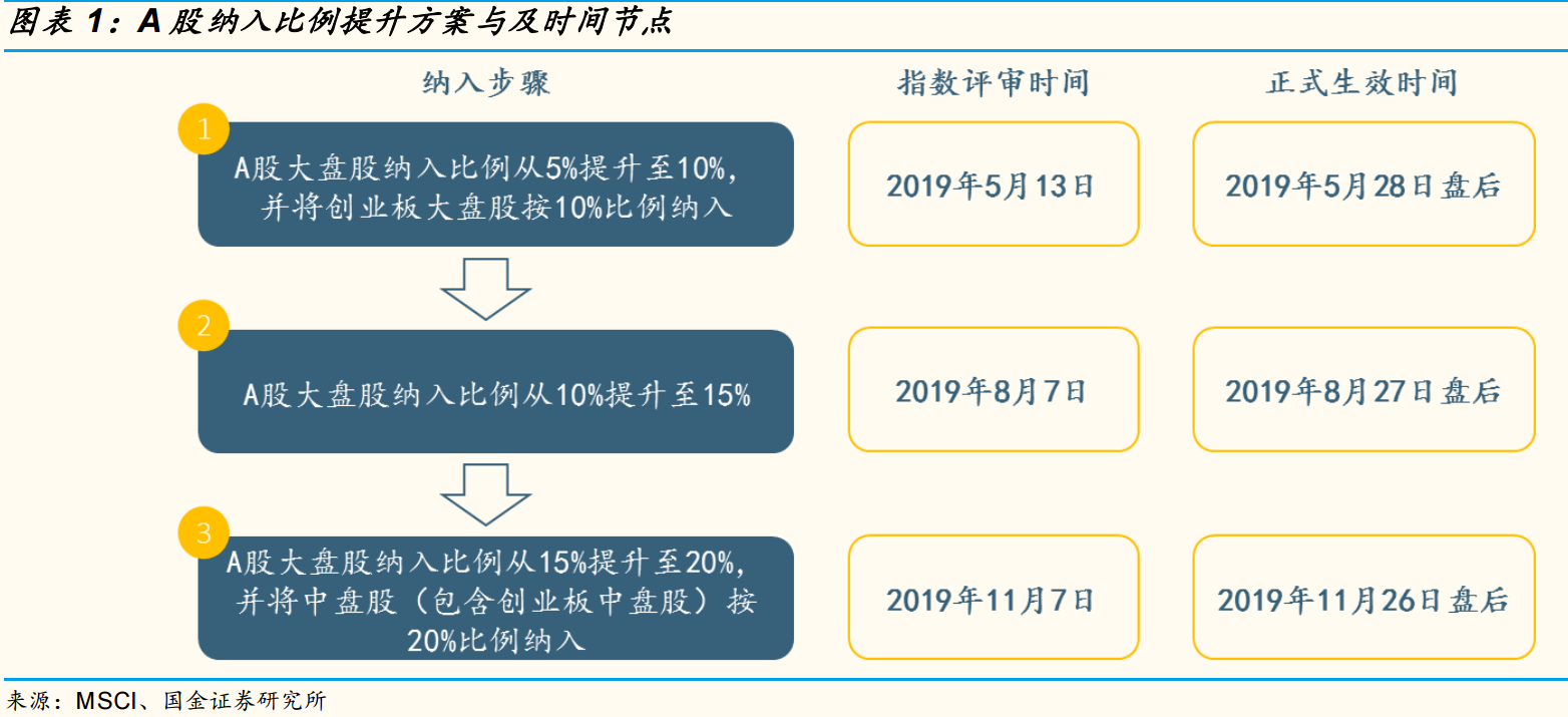 第一步,2019年5月半年度指数评审后,将A股大盘股纳入比例从5%提升至10%,同时将创业板大盘股按10%比例纳入;